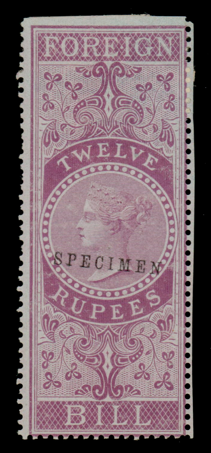 India Revenues: QV Foreign Bill 12a purple, with SPECIMEN overprint in serif caps, mint.