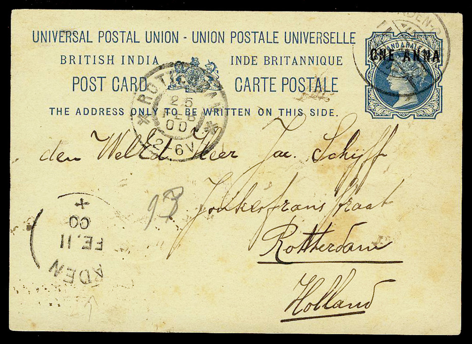 India used in Aden: QV 1a on 1½a UPU postcard cancelled ADEN-CAMP used 1900 from Perim to Holland with ADEN transit