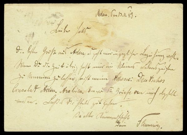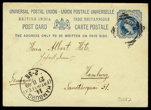 India used in Aden: QV 1a on 1½a UPU postcard cancelled ADEN squared circle, used 1889 to Germany