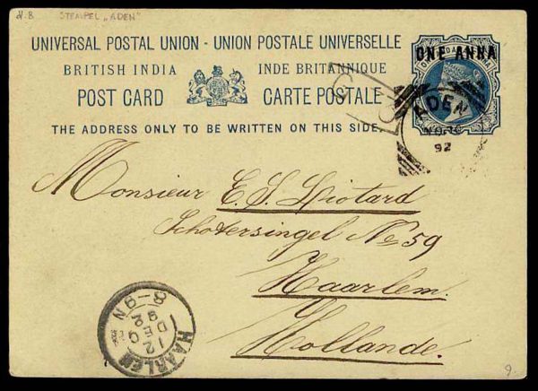 India used in Aden: QV 1a on 1½a UPU postcard cancelled ADEN squared circle, used 1892 to Netherlands