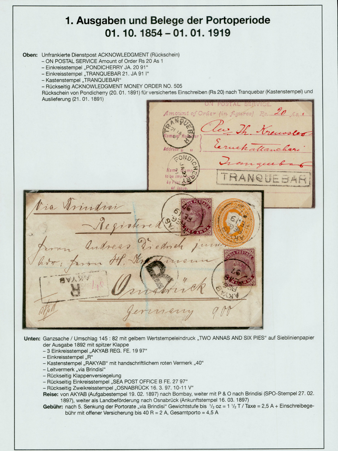 India used in Burma: AKYAB cancels on 1897 QV 2a6p uprated registered stationery to Gemany. Another Postal Acknowledgement from TRANQUEBAR to PONDICHERRY