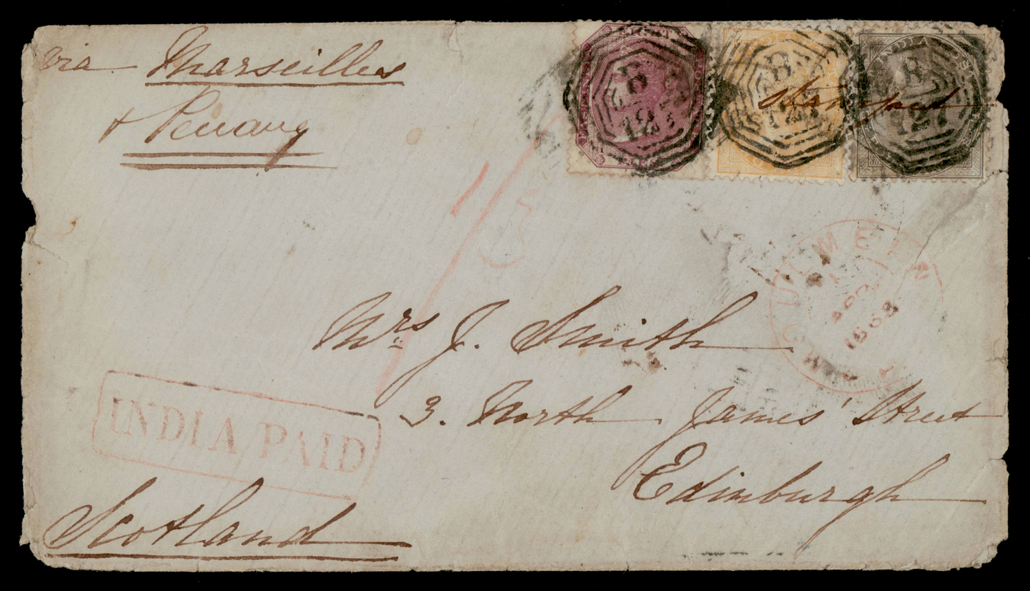 India used in Burma: B/127 type 7 and corresponding MOULMEIN cds on 1868 10a8p cover to Scotland via Marseilles and Penang, boxed INDIA PAID, cover with various edge wear