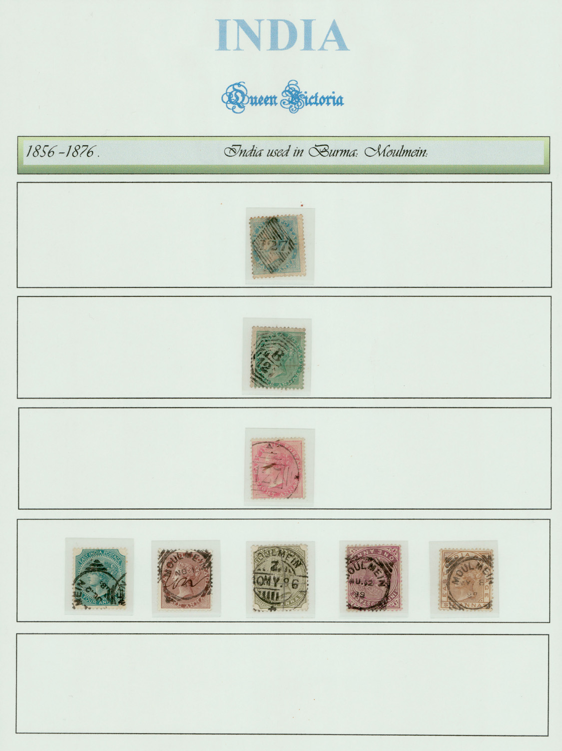 India used in Burma: Moulmein cancels on various East India and QV stamps