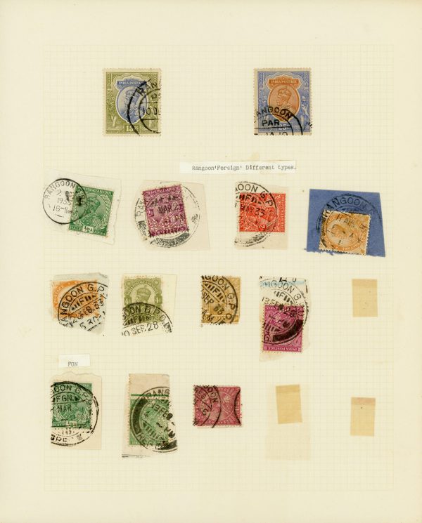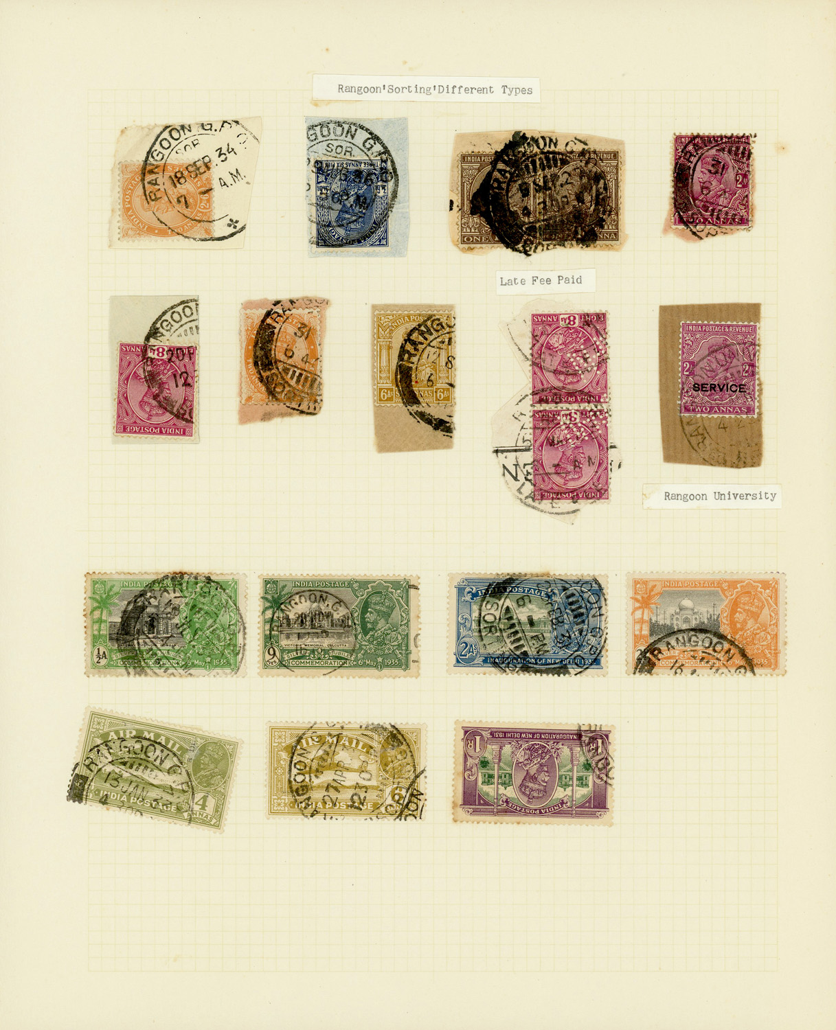 India used in Burma: RANGOON cancels on various GV stamps to 25r, on 2 pages