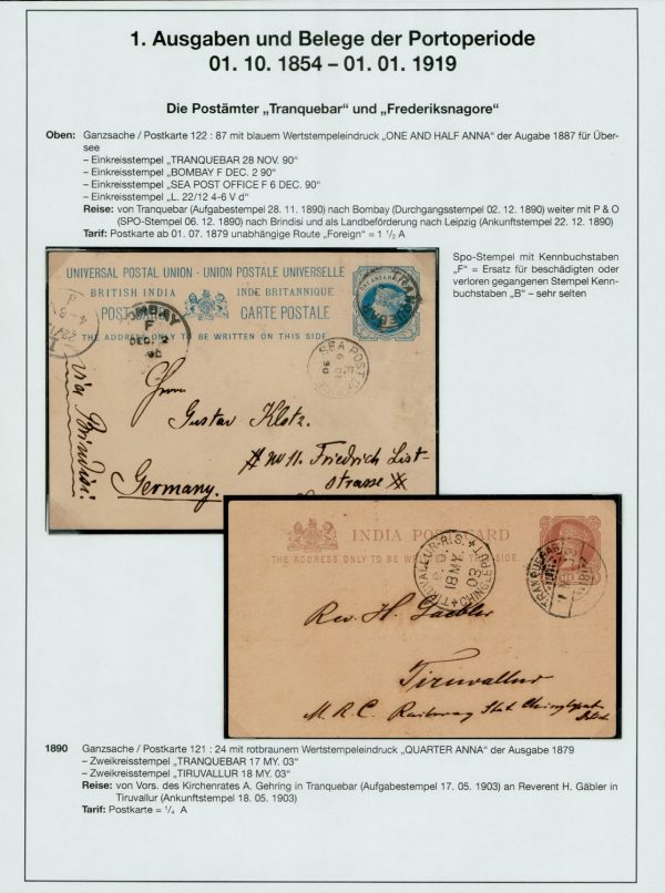 India used in ex Danish Occupation: 1890 UPU postcard to Germany and QV ¼a postcard, each used from TRANQUEBAR