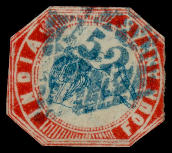 India used in ex-Danish Settlement: C/152 type 6 of Tranquebar in blue on 1854 4a imperf, cut-to-shape, a hard to find cancel on this value