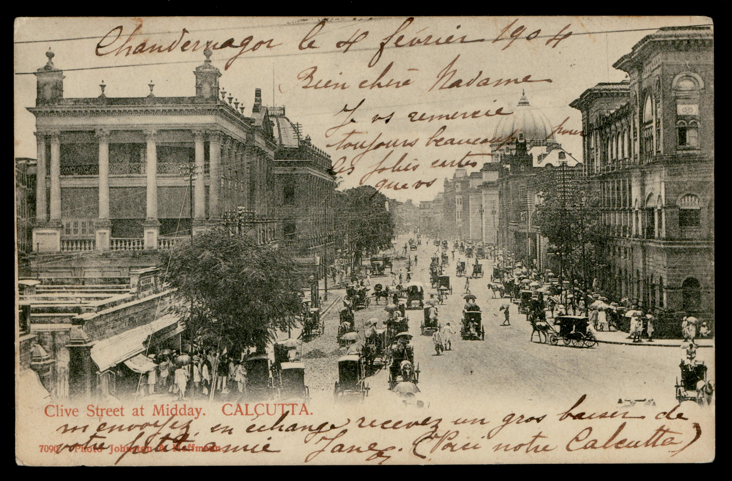 India used in French India: 1894 CHANDERNAGORE s.c. on picture postcard, depicting Clive Street at Midday, Calcutta, to France with SEA POST OFFICE cancels