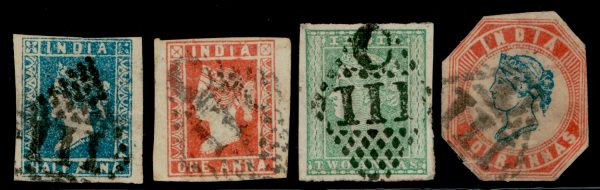 India used in French India: C/111 of Pondicherry type 6 cancels on 1854 ½a, 1a, 2a, and 4a