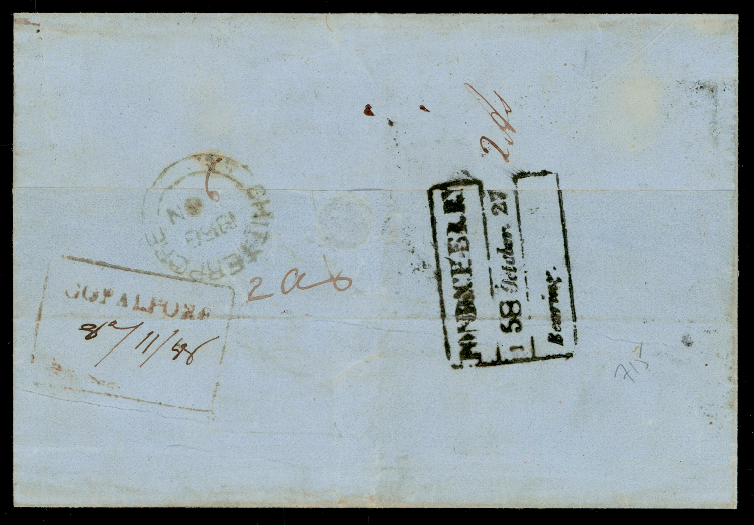 India used in French India: C/111 Pondicherry type 6 cancels on 1858 (Oct 27) cover to Ganjam, f.w. EI QV ½a x 2 pairs, with Gravier & Podlain Freres oval, boxed INSUFFICIENT and GOPALPORE (Nov 11) Bearing 2as on back, Madras (Oct 29) transit and CHITTERPORE (Nov 9) dely cds on reverse