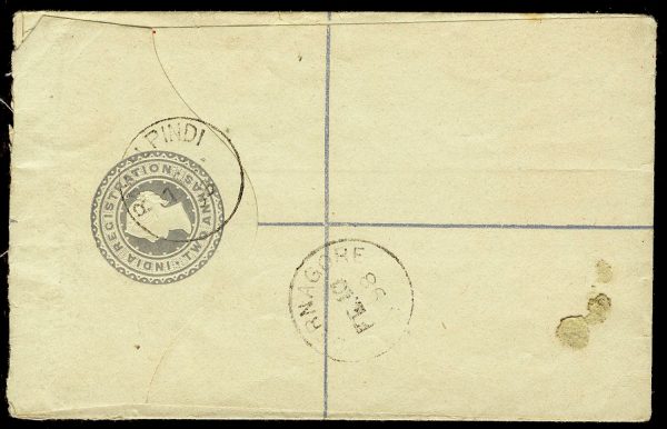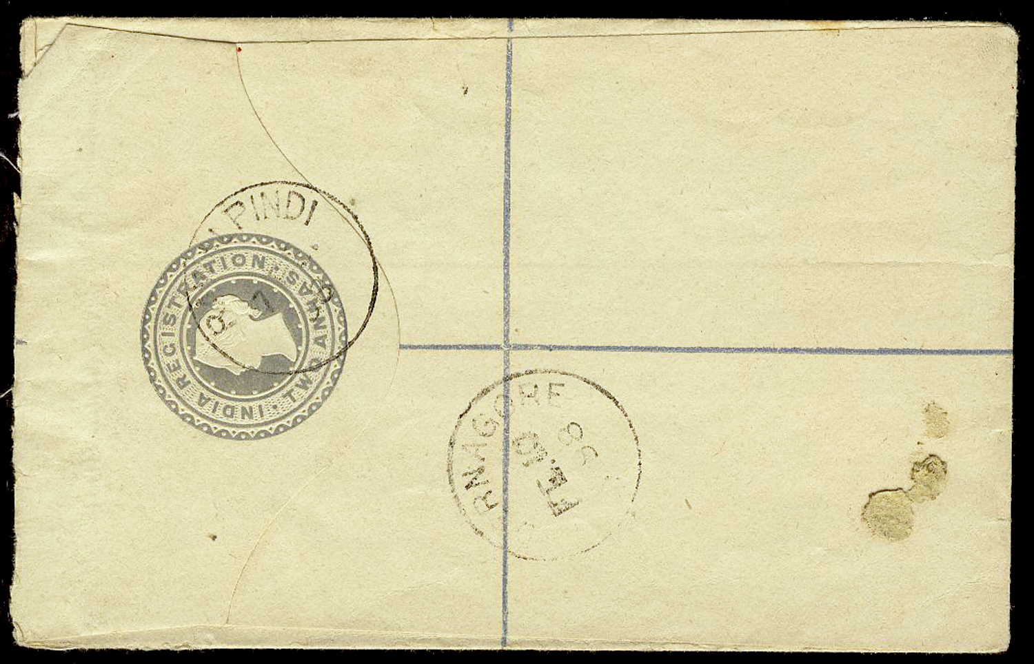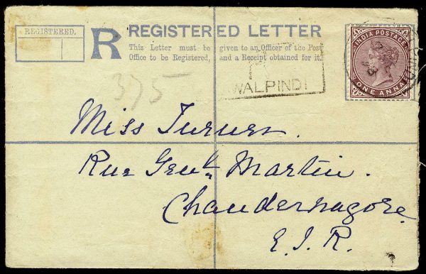 India used in French India: CHANDERNAGORE arrival cds on 1898 QV 2a registered postal stationery envelope additionally franked with QV 1a cancelled “RAWALPINDI/7 FE./98” and boxed registration mark