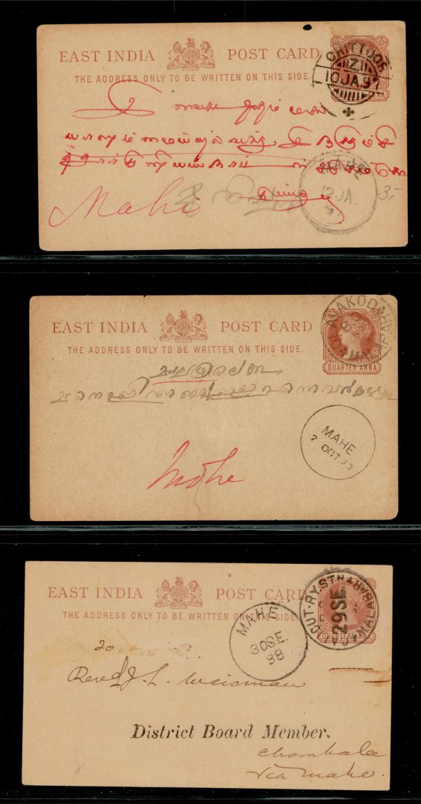 India used in French India: MAHE arrival cds on various postcards (3)