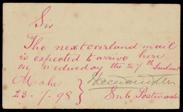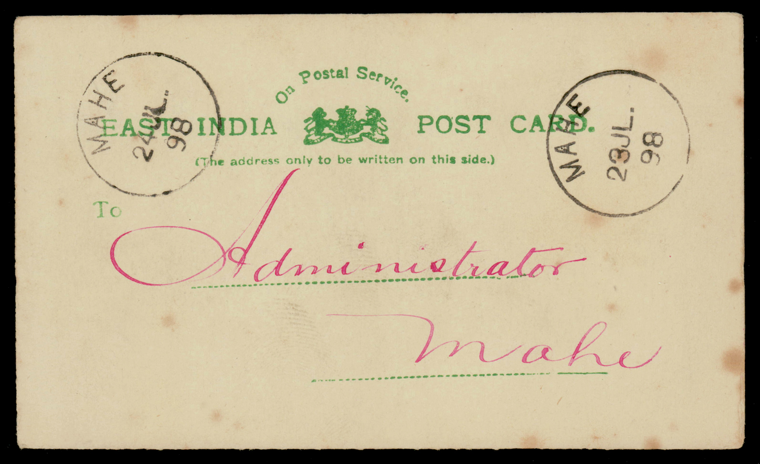 India used in French India: MAHE curved line within single circle ds on East India Service postcard used 1898 within Mahe
