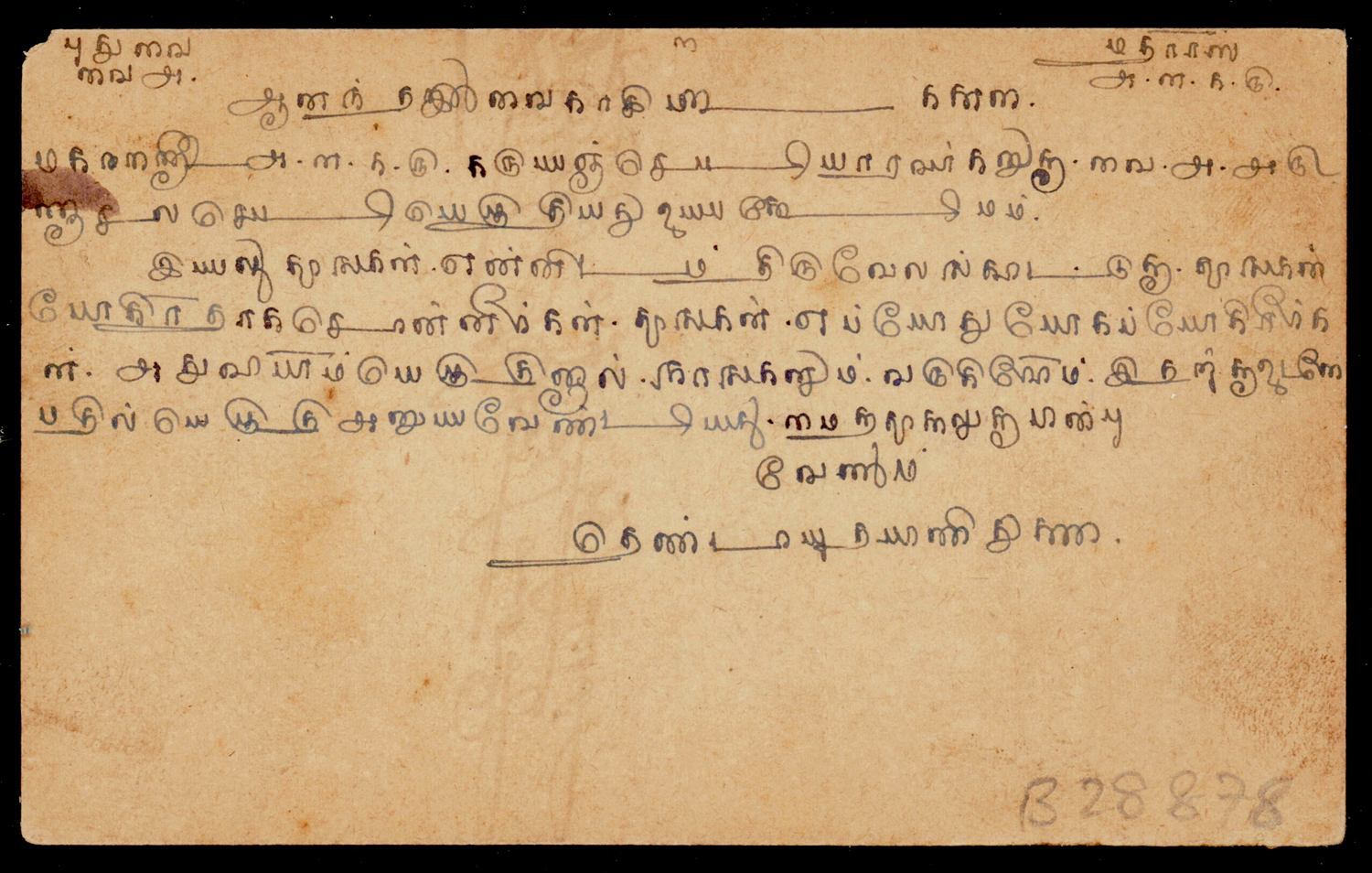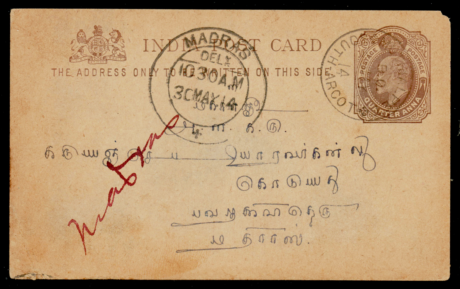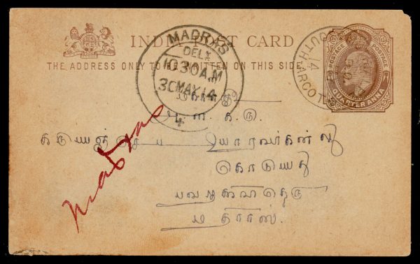 India used in French India: MUTHIALPET (sub post office of Pondicherry) cancel on 1914 (May 28) Edward ¼a postcard to Pudukottah. Scarce usage