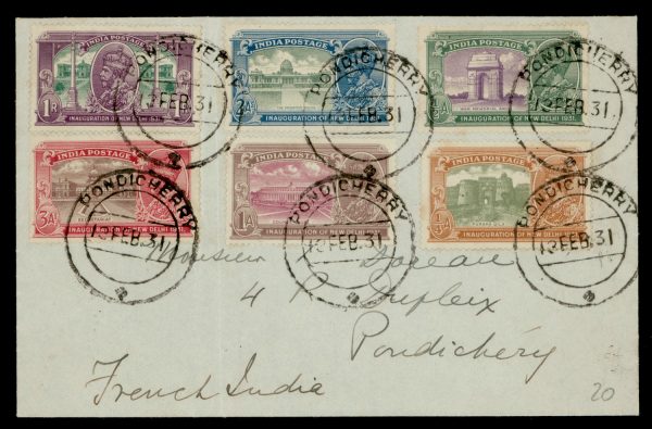 India used in French India: PONDICHERRY cancels on 1931 (Feb 12) cover franked with 1931 GV Inauguration set of 6. SG 226/231