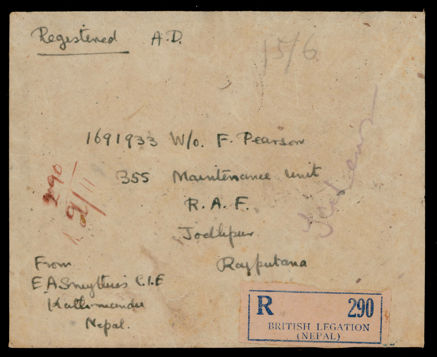 India used in Nepal: GVI 4a + 1½a tied by BRITISH LEGATION (NEPAL) REG cds on 1945 registered cover with Jodhpur delivery