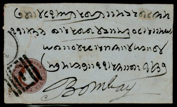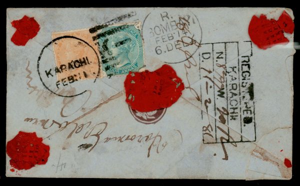 India used in Pakistan: QV 8a tied by KARACHI/K-1 duplex on 1881 registered uprated QV stationery to Bombay