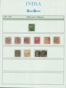 India used in Singapore: B/172 cancels on various QV stamps on page including 1854 2a imperf