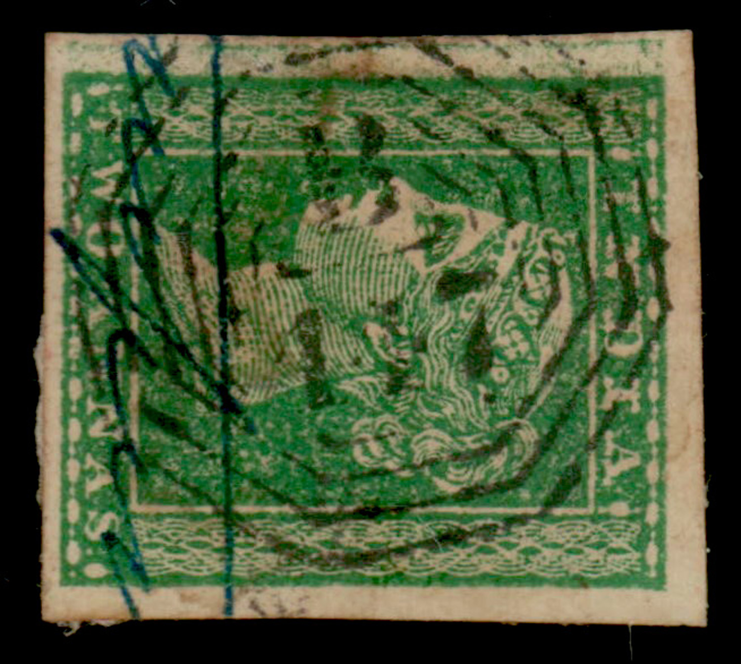 India used in Straits Settlements: B147 Penang cancel on 1854 2a green imperf, with extra green ink on left of stamp