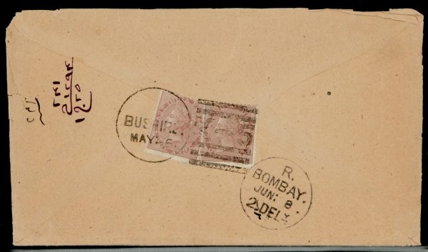 India used in the Persian Gulf: BUSHIRE/K-5 duplex cancel on cover f.w. QV 1ax2 to Bombay